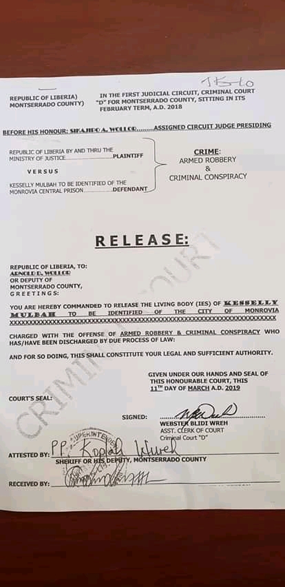 ” We wish to inform the General Public that such assertion from Mr. Costa is categorically false and misleading because, while it is true that one of the many functions of our prison system is to commit and release criminal offenders of society, said function can only be executed legally, not through an individual’s mandate as insinuated by Mr. Costa. So, please note that, in accordance with legal documents within the prison system, one Mr. Kesselly Mulbah was released on March 11, 2019 by Criminal Court “D” for Montserrado County”, Assistant minister Trawally stated.