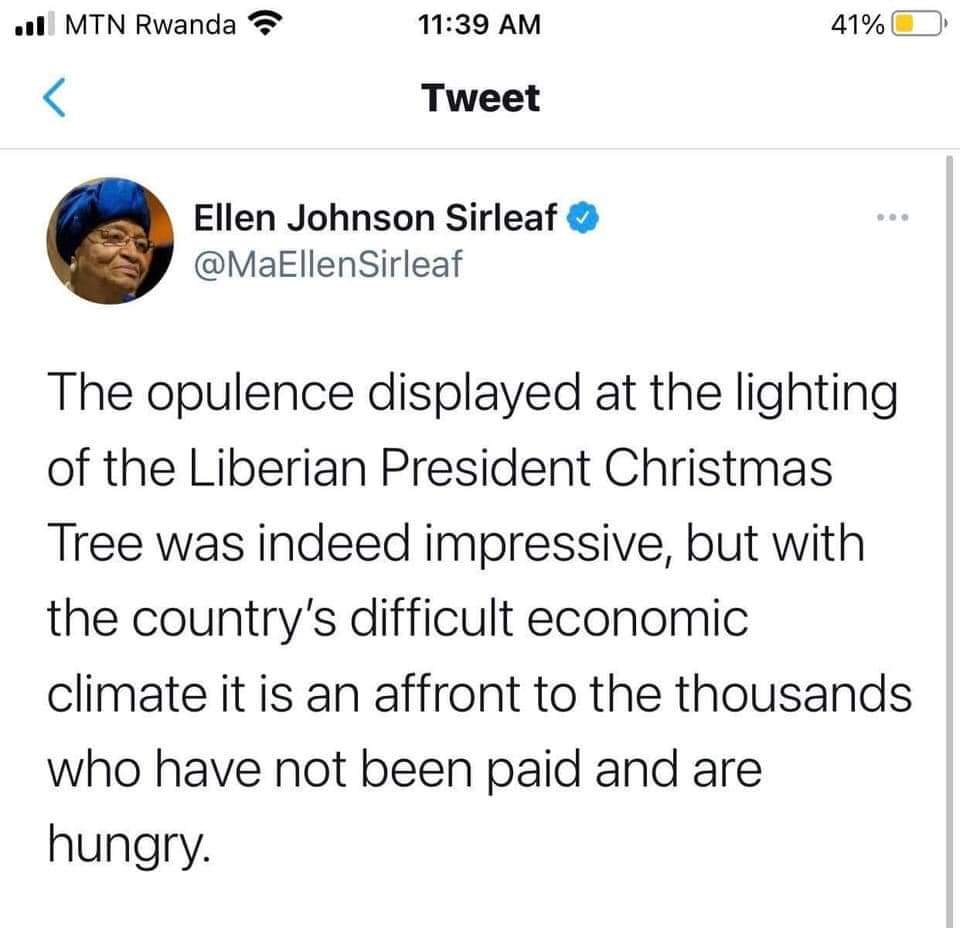 Monrovia-December 21, 2020: Hours after madam Sirleaf twitted saying opulence displayed at the lighting of the president Christmas tree was indeed impressive but with the country difficult economic climate, it an affront to the thousands who have not been paid and are hungry. But in a direct response, president Weah said Madam Former President, let me refresh your memory about what OPULENCE is: