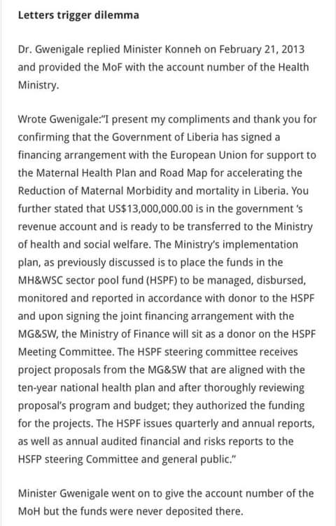 To the issue Sir, you posted under my post a frontpage Africa story claiming that it clarifies the usage of EU 13m usd for Maternal Mortality and Morbidity. You really serious Sir? From reading your FPA story of defense you wrote a communication to the Health Minister to forward your office their account information for the transfer of the money into such account. The Health Minister did exactly what you requested of him so did you comply? If you did can you post the transfer or deposit slips as you hastily did under my yesterday post by showing the international transfers from the EU to the CBL?