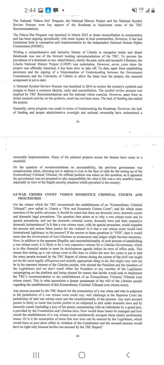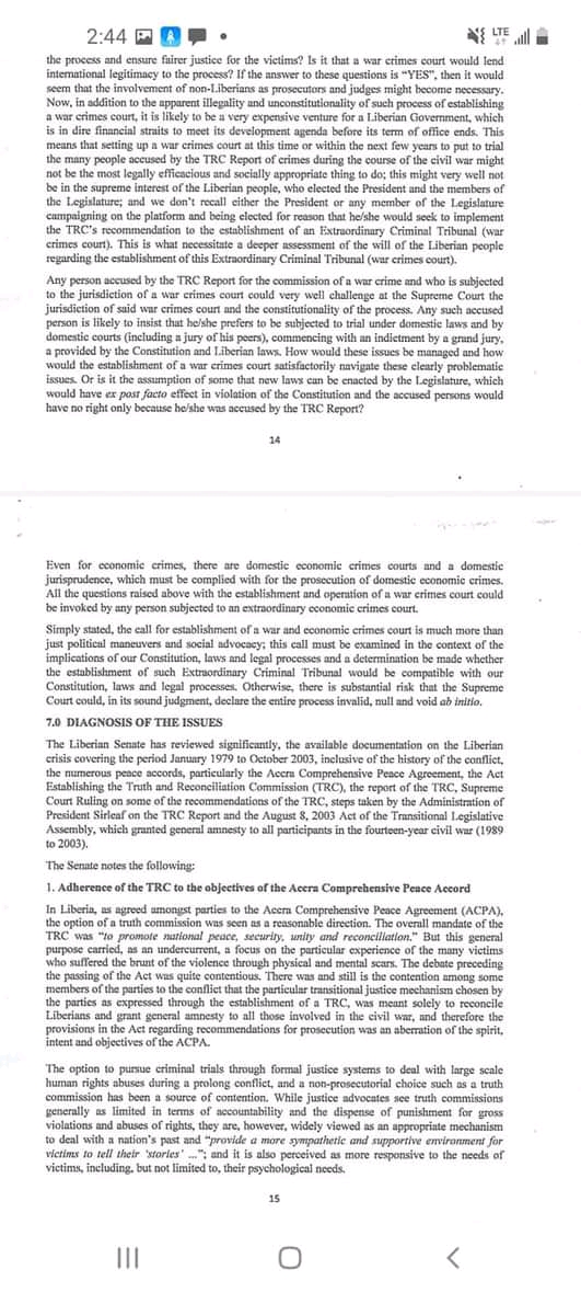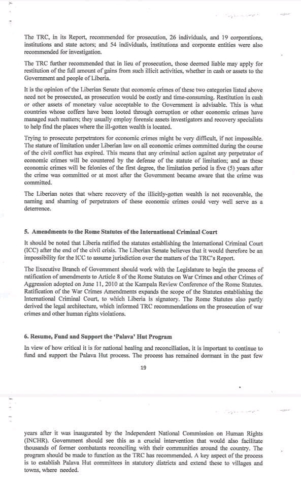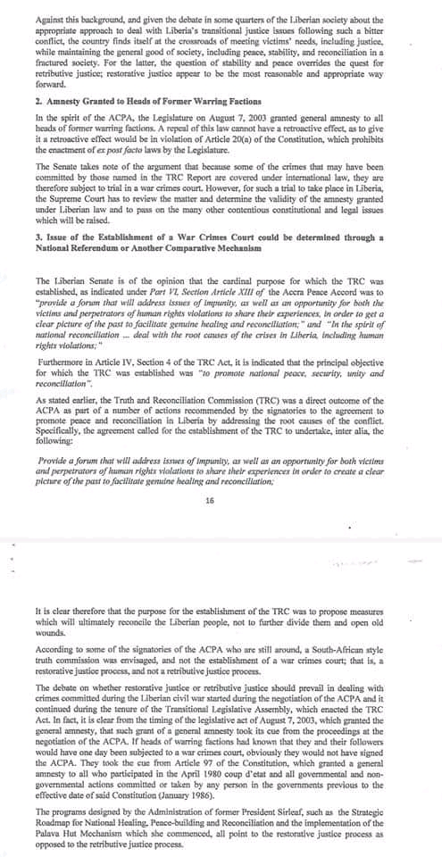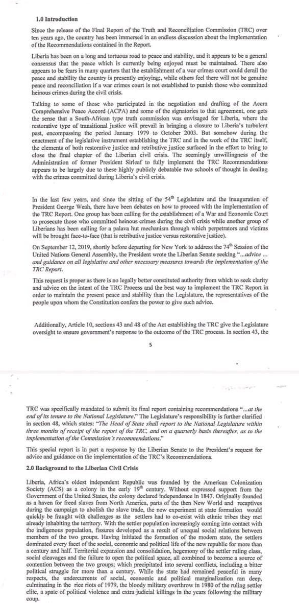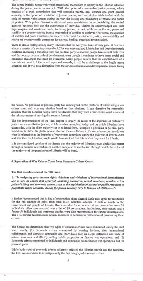 Monrovia-June 22, 2021: The Liberian Senate has responded to President George Weah’s 2019 letter about providing recommendations on the way forward on the establishment of the War and Economic Crimes Court. The Senate, in a lengthy document has adviced the president to set up the Transitional Justice Commission (TJC) and said Commission should be enacted into law.