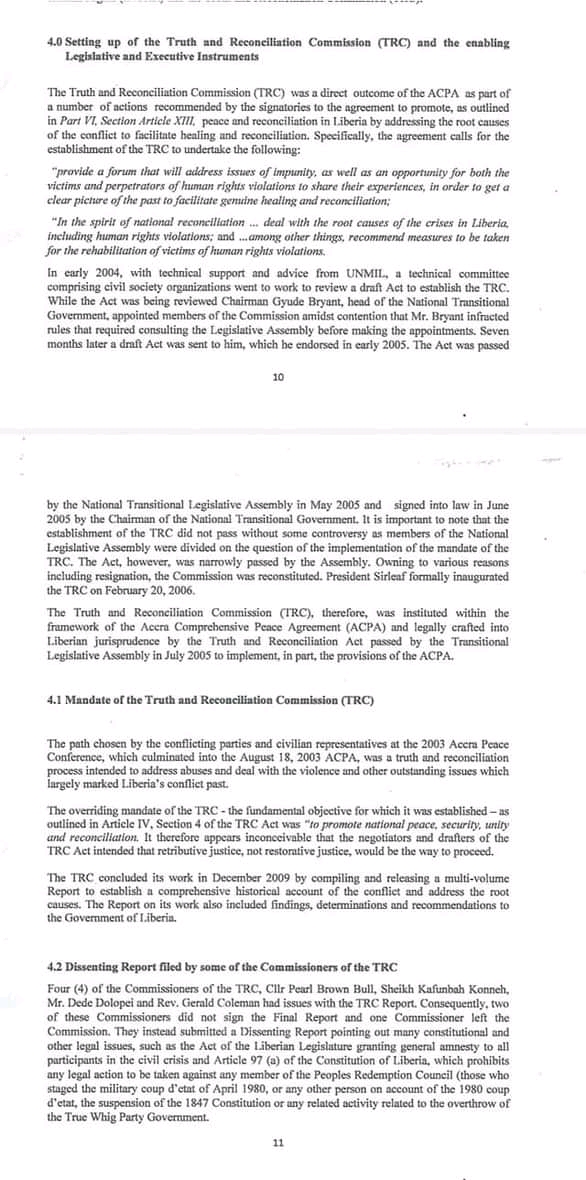 To examine the effect of the 2003 act of the legislature, which granted general amnesty to all participants in the civil crisis; To analyze credibility, legitimacy issues surrounding the fiscal report of the TRC in respect of the fact that four(4) of the Commissioners had serious issues with the report and consequently,two of the Commissioners did not sign the final report,but instead presented a dissenting report.