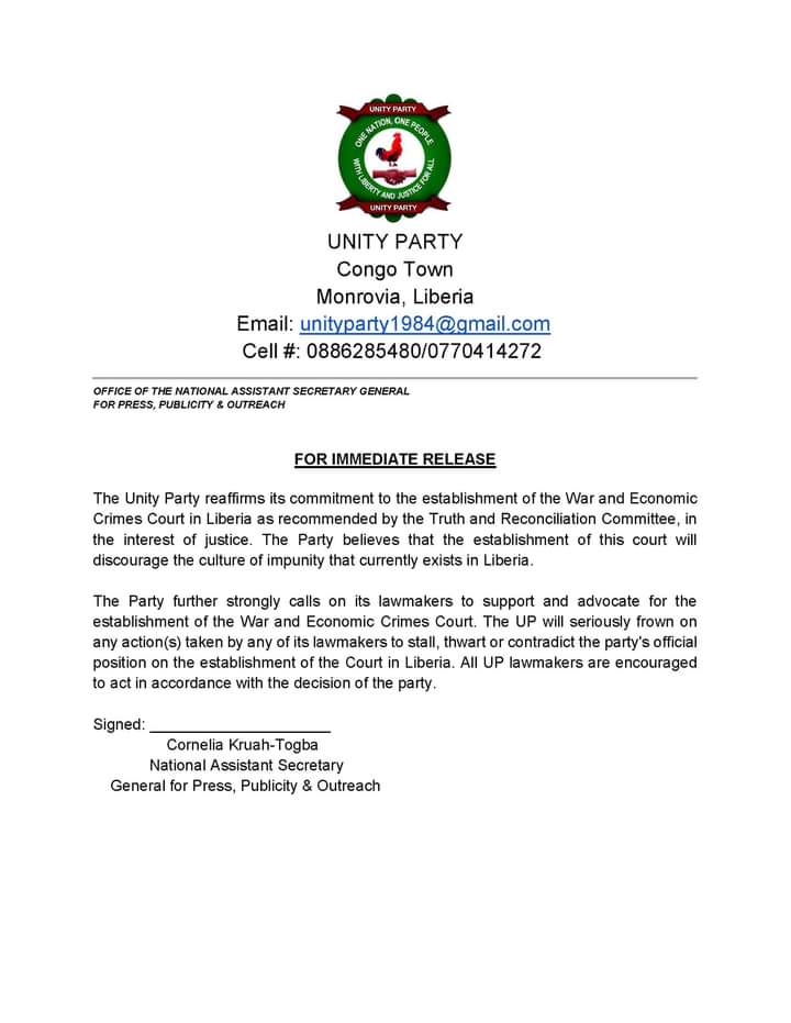 Monrovia-June 23, 2021: As the debate for the establishment of the War and Economic Crimes Court intensifies in and out of the country, The opposition Unity Party reaffirms its commitment to the establishment of the War and Economic Crimes Court in Liberia as recommended by the Truth and Reconciliation Committee, in the interest of justice.