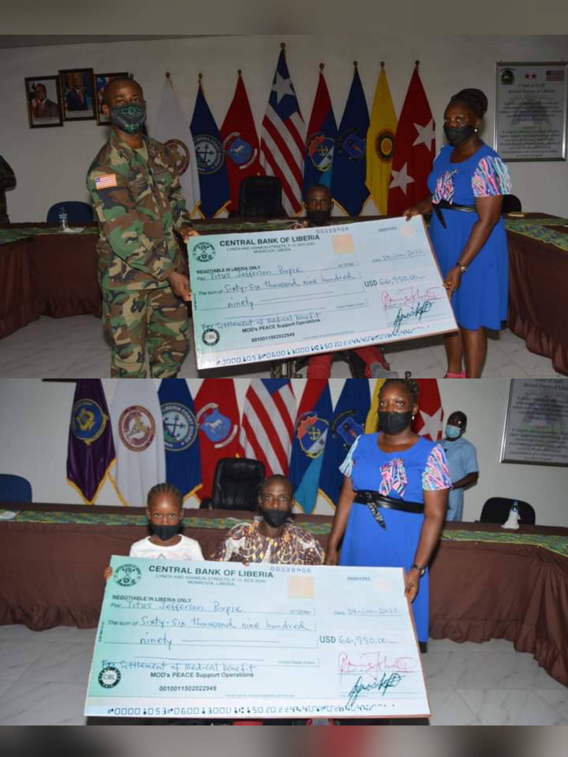 Monrovia-June 28, 2021: The United Nations Headquarters based in the United States through the government of Liberia has turned over a check of Sixty-Six Thousand Nine Hundred and Ninety United States Dollar (66, 990 USD) to SSG Jefferson Parpie Titus of the Armed Forces of Liberia (AFL) as Permanent Disability Benefit.