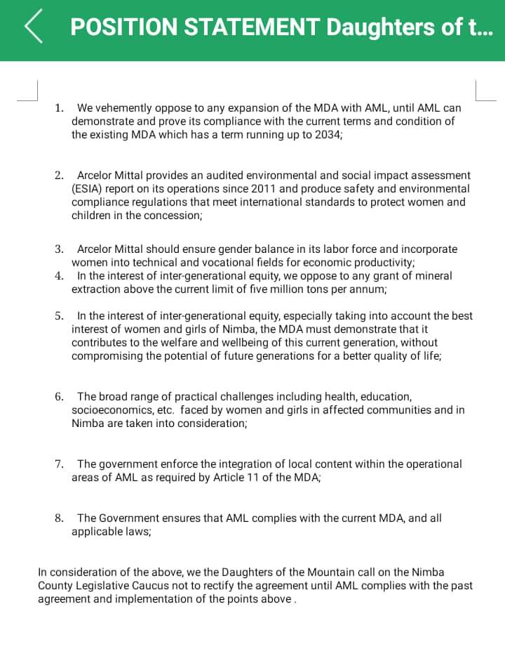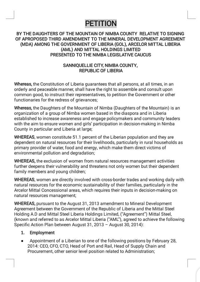 Monrovia-September 24, 2021: Week after former Grand Bassa county Senator, Gbenzonhgar Findley filed a law sue against Arcelormittal for not committing to its agreement with Grand Bassa county, the Daughters of the Mountain has petitioned members of the Nimba Legislative Caucus against the rectification of a proposed expansion and extension of the Mineral Development Agreement signed between the Government of Liberia and Acerlor Mittal Liberia.