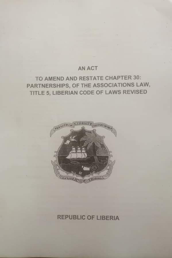 The second piece of legislation from the President is An Act to Amend and Restate Chapter 30: Partnerships of the Associations Law, Title 5, Liberian Code of Laws Revised.