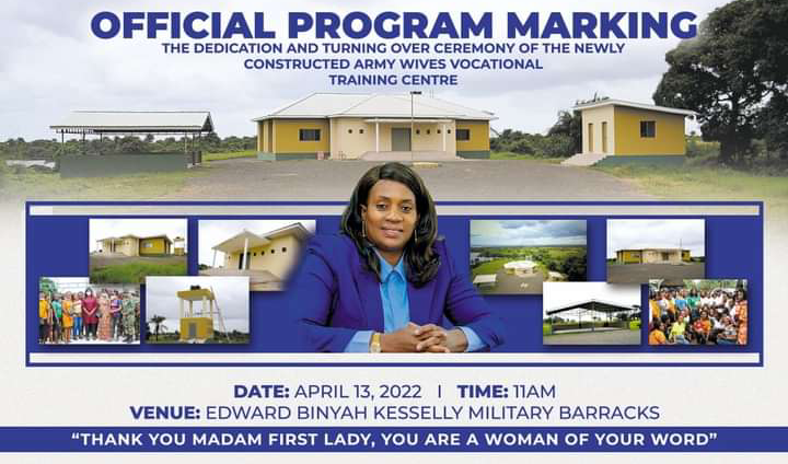 Monrovia- April 13, 2022: The office of the First Lady Madam Clar Marie Weah has disclosed that the first lady will be turning over a modern state-of-the-art vocational training center to Army wives at the Edward BM kesselee Barrack In shiefflin, Margibi County.