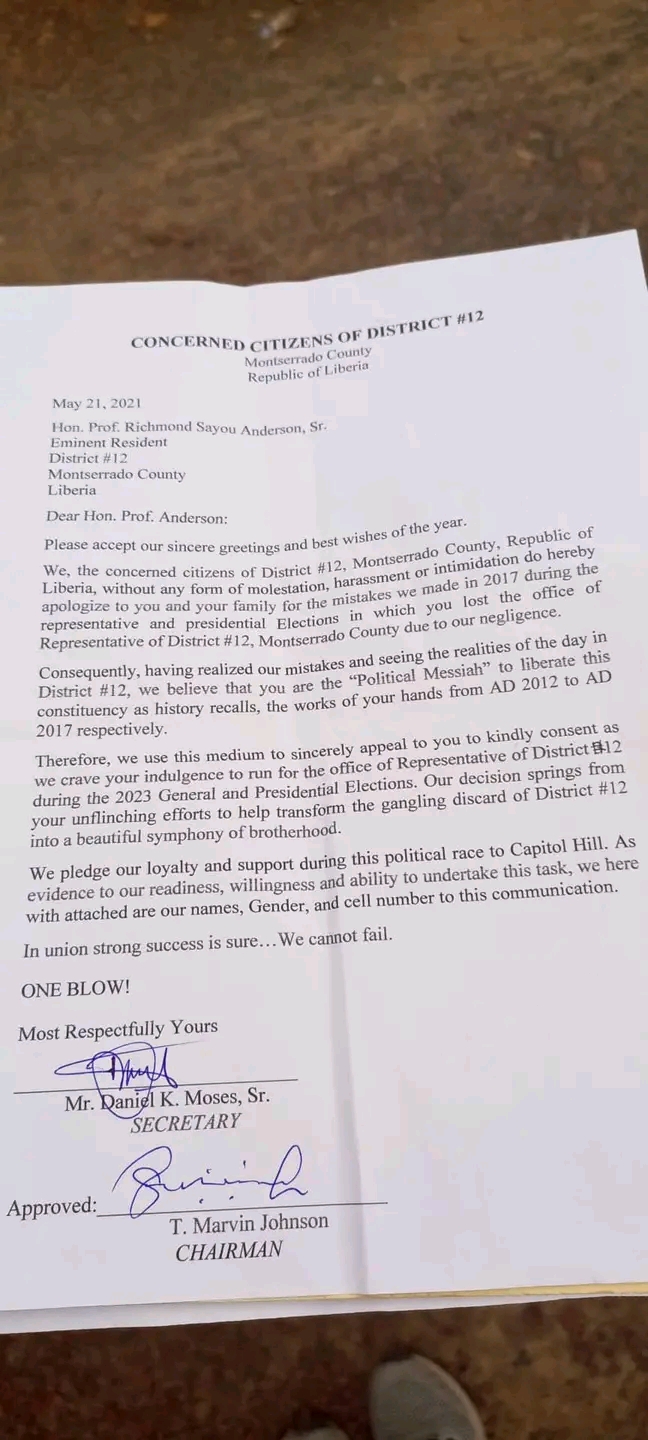 Monrovia-May 22,2022: On Saturday, May 21, 2022, a group of citizens under the banner, Concern Citizens of District Twelve (12) assembled and appealed to their District former Representative, Hon. Richmond Sayou Anderson to contest for the District seat in the 2023 elections, which they considered has been vacant due to the absence of the district present representative Hon. George Beyan Samah.