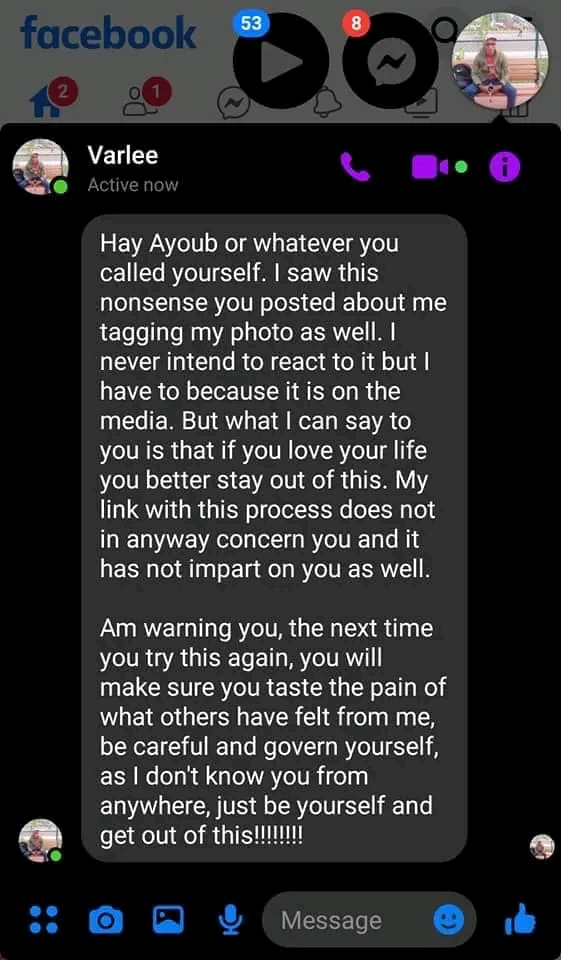 Ayoub Dukuly claimed that he flagged Cllr. Verdier’s allegation against Terleh on his Facebook page and minutes later, the accused replied to his Facebook post with a message of his own; that threatened to harm him if he did stay away from the case. See the screenshot of the post.