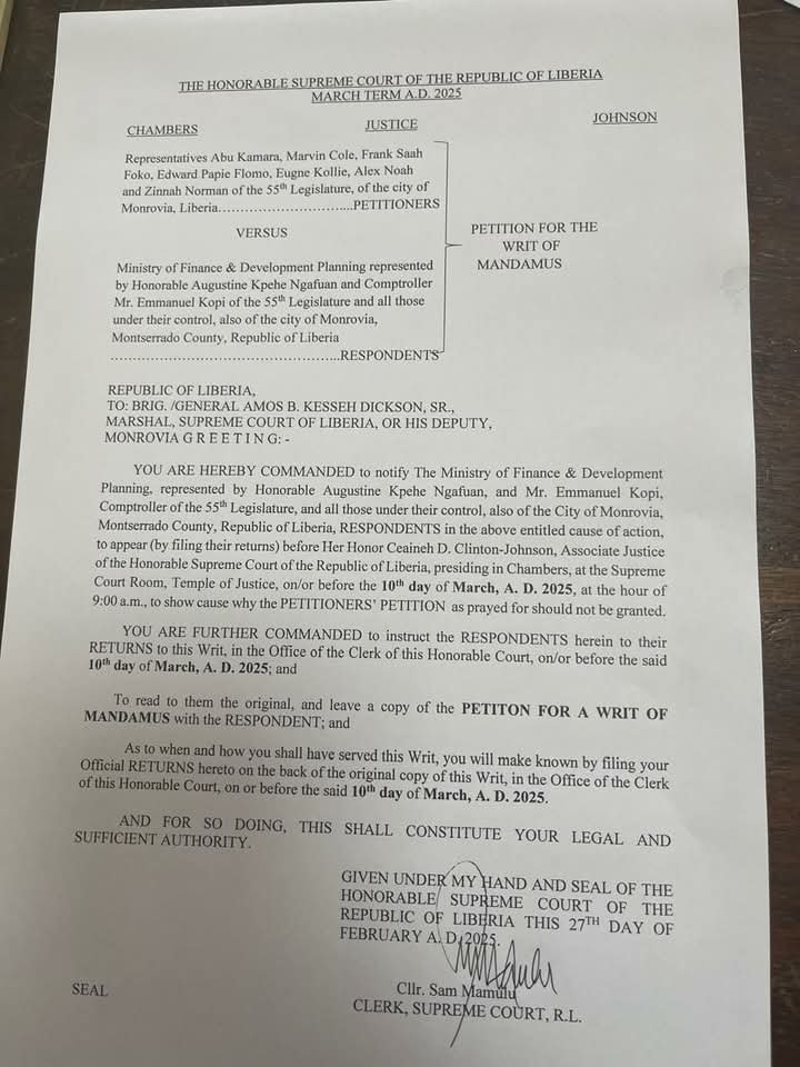 This legal development follows a petition by Representatives Abu Kamara, Marvin Cole, Frank Saah Foko, Edward Papie Flomo, Eugene Kollie, Alex Noah, and Zinnah Norman, who claim that their pay has been wrongfully withheld since their suspension by the Majority Bloc.