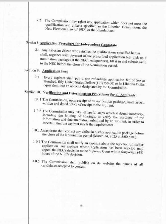 According to Section 6.1.6 of the NEC guidelines, independent candidates must demonstrate a minimum bank balance of US$10,000.00 or its equivalent in Liberian Dollars, alongside an insurance policy valued at no less than US$100,000.00 or the equivalent in Liberian Dollars. Political entities or coalitions supporting candidates are also required to meet these financial benchmarks.