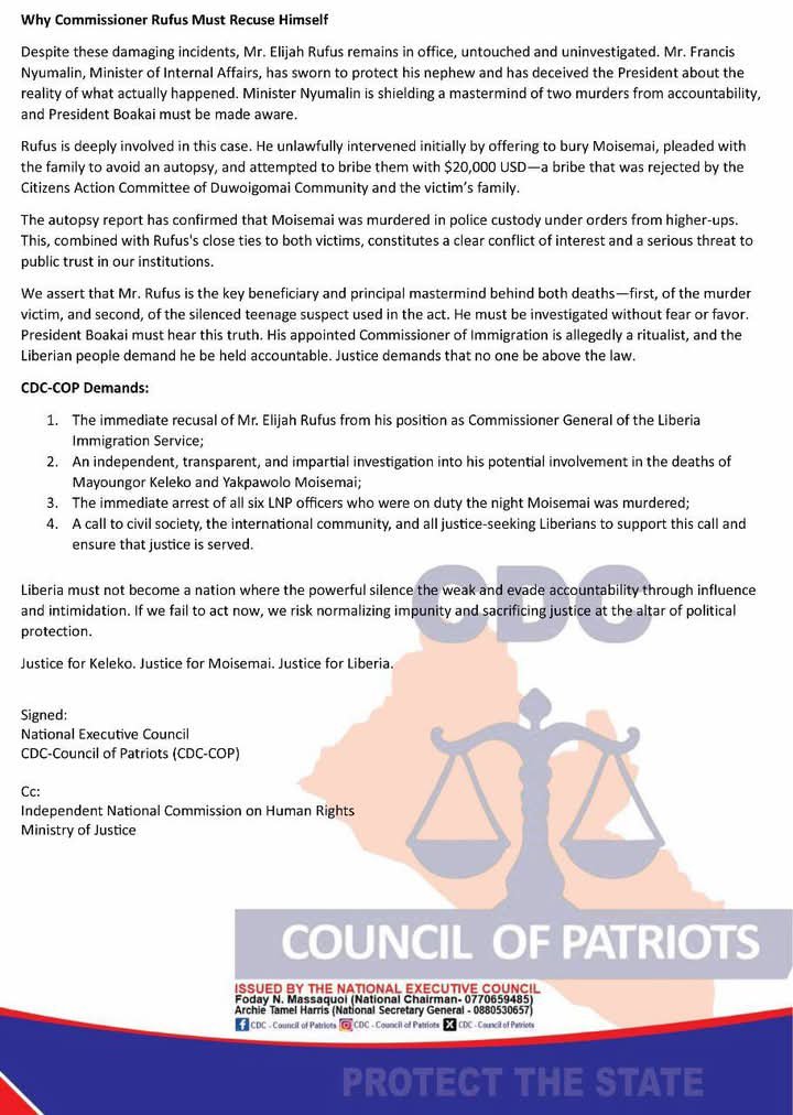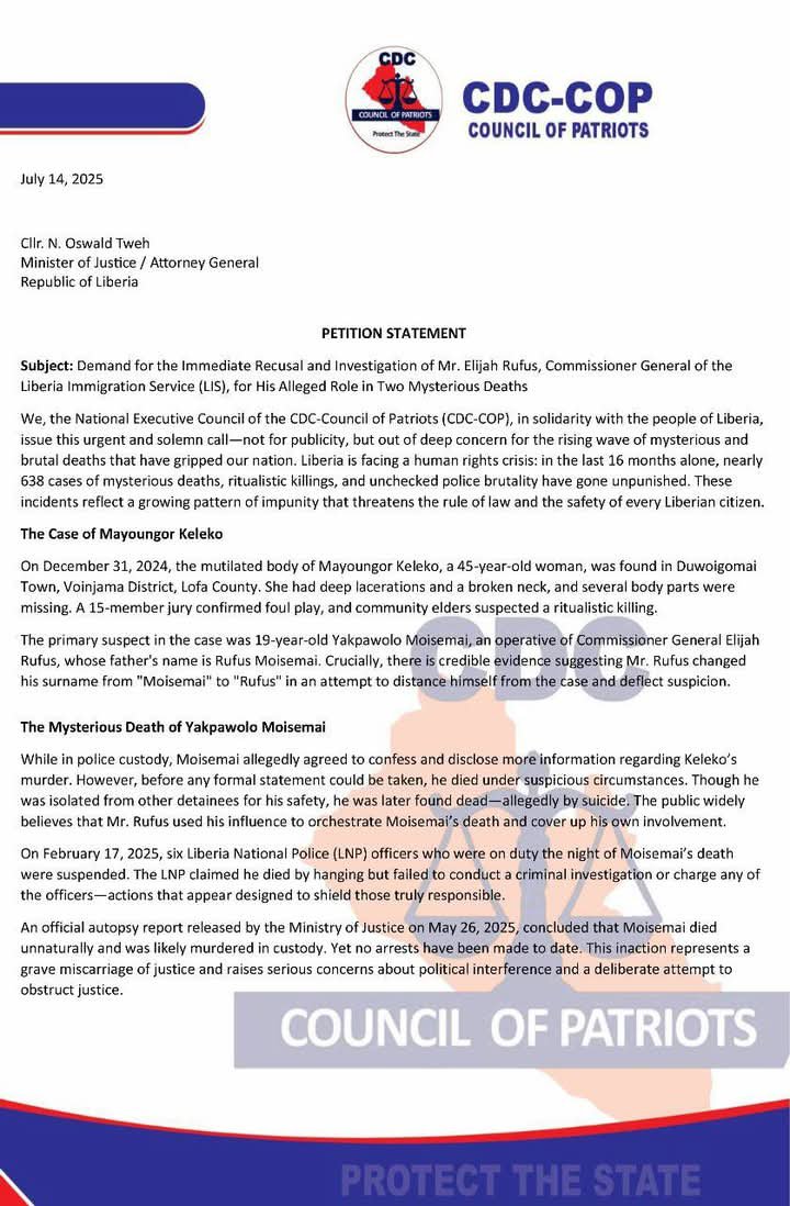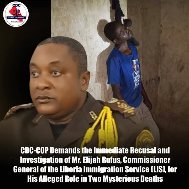 Monrovia- CDC-COP has Petitioned the Independent National Commission on Human Rights and the Ministry of Justice on the Alarming Rate of Mysterious Deaths in Liberia; Demands the Immediate Recusal and Investigation of Mr. Elijah Rufus, Commissioner General of the Liberia Immigration Service (LIS), for His Alleged Role in Two Mysterious Deaths.