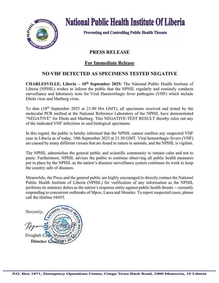 Monrovia – September 12, 2025: The National Public Health Institute of Liberia (NPHIL) has strongly denied rumors of an Ebola outbreak in the country, confirming that there are no suspected or confirmed cases. “All specimens tested at the National Reference Laboratory returned negative results for Ebola and Marburg viruses” NPHIL said in her press statement.